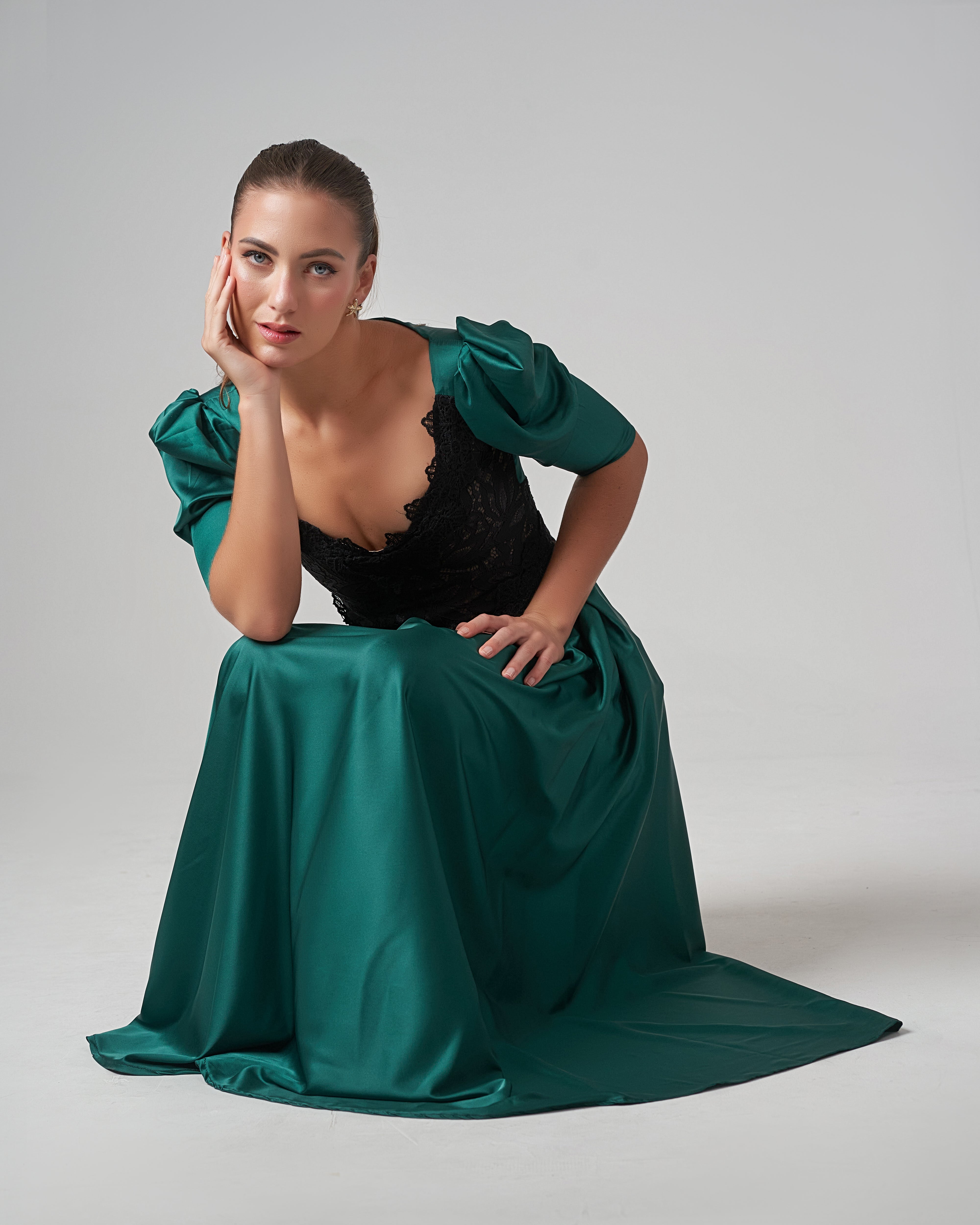 The Lace-Trimmed Puff Sleeve Silk Maxi Dress – Green combines a richly detailed black lace bodice with a deep emerald silk maxi skirt, creating a look that is both timeless and striking.