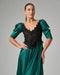 The fitted lace-trimmed bodice defines the waist beautifully, while the softly structured puff sleeves add a touch of vintage-inspired charm. Falling into a fluid silk maxi skirt, the dress moves with ease and elegance—perfect for celebrations, evening occasions, and refined daytime events.