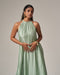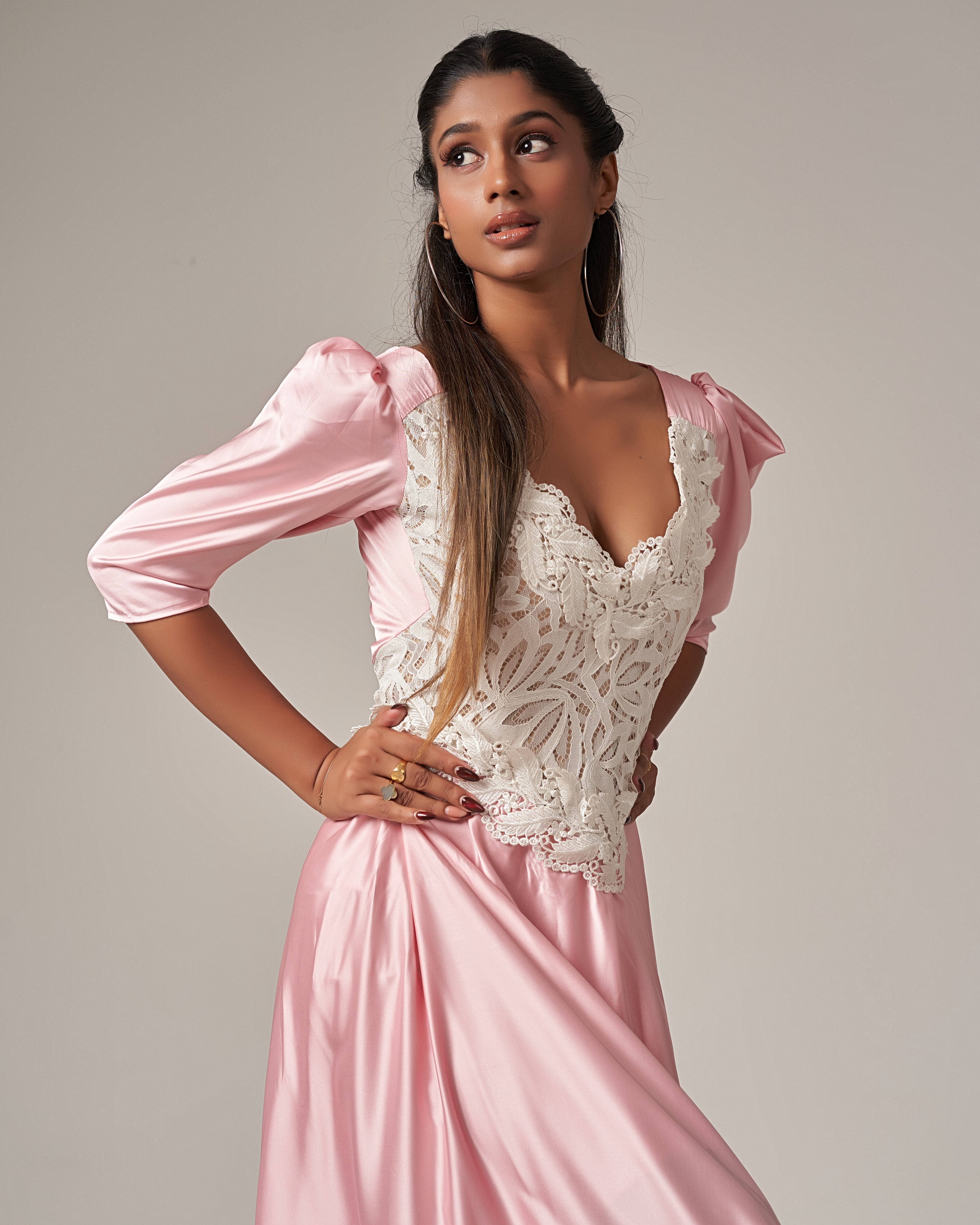The Lace-Trimmed Puff Sleeve Silk Maxi Dress – Pink blends delicate lace detailing with a flowing blush silk silhouette, creating a look that feels graceful and timeless.