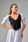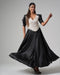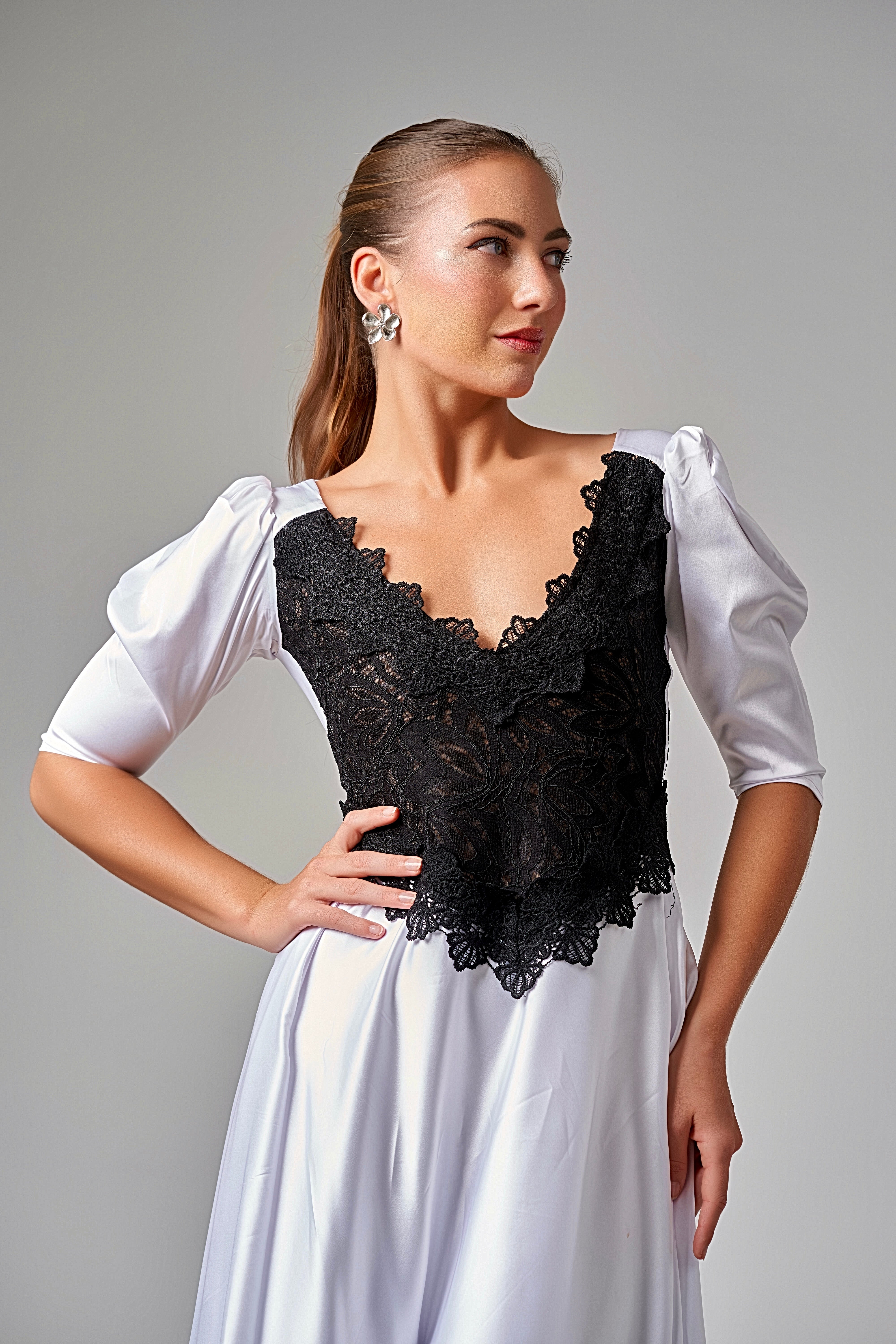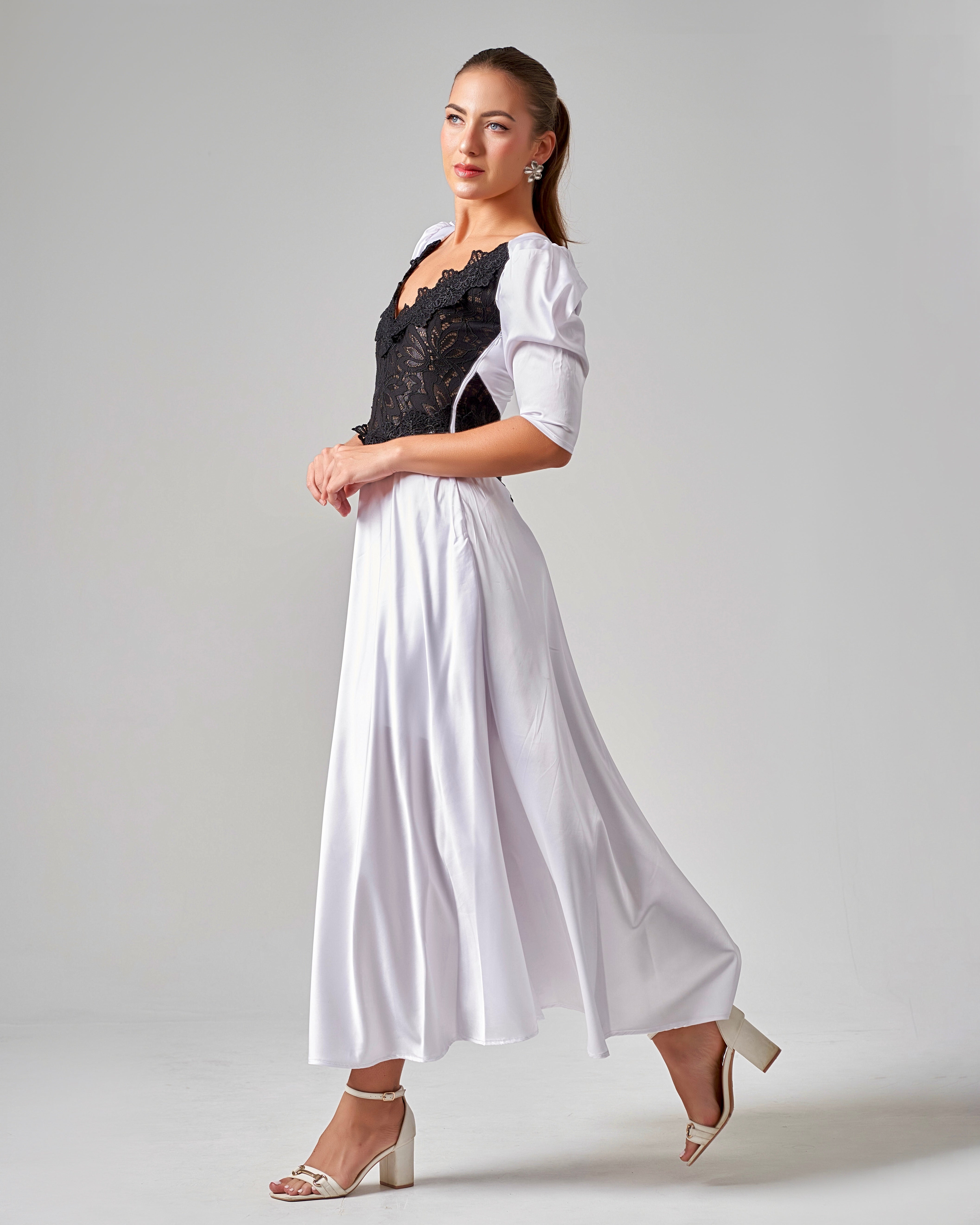 The Lace-Trimmed Puff Sleeve Silk Maxi Dress β White blends delicate black lace detailing with a flowing white silk silhouette, creating a striking balance of romance and sophistication.