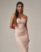 Featuring a structured bust with delicate shoulder straps, Midnight Noir defines the waist and flows into a sleek midi length for an elongated finish. Perfect for evening events, formal dinners, or nights where understated glamour speaks louder than words.