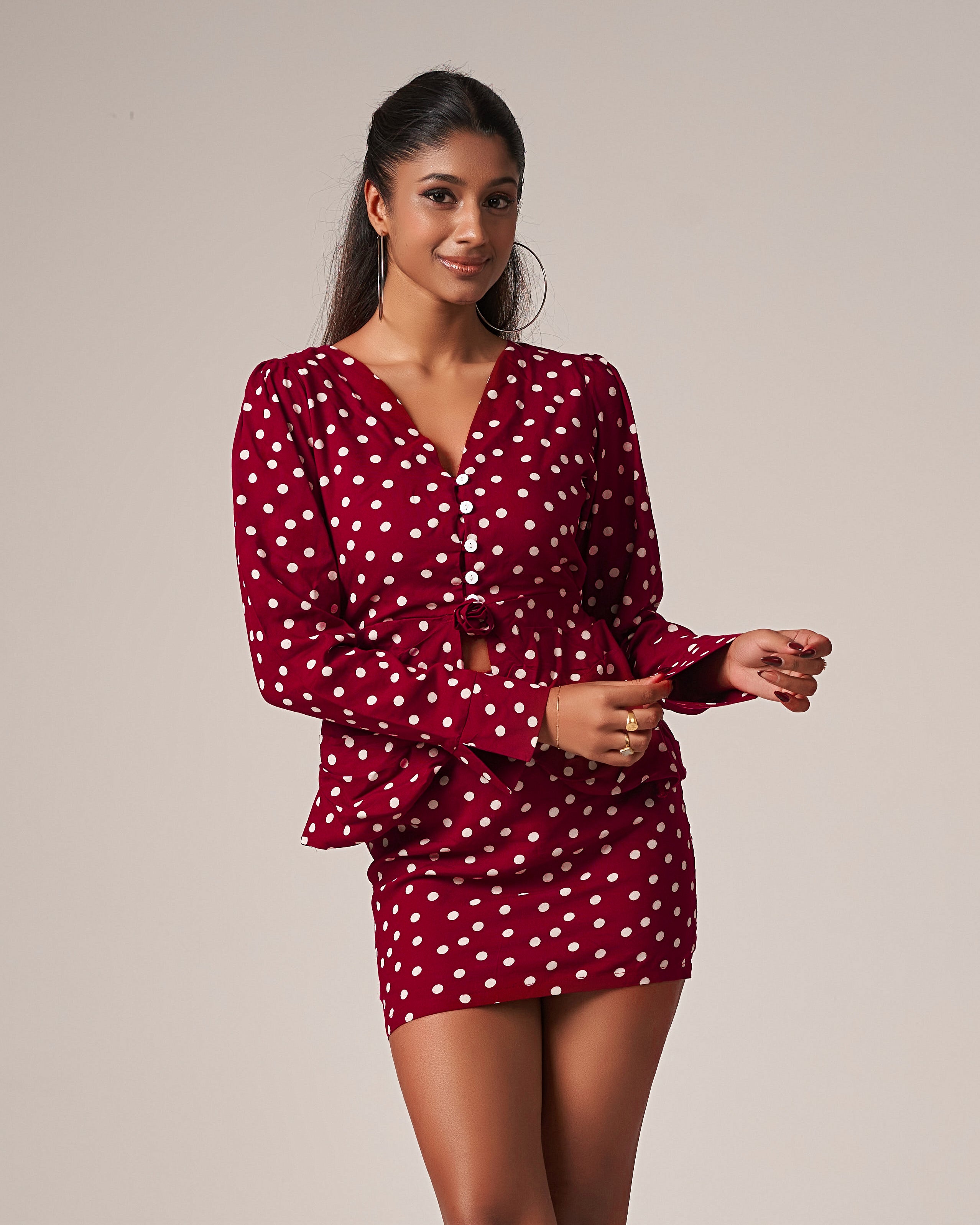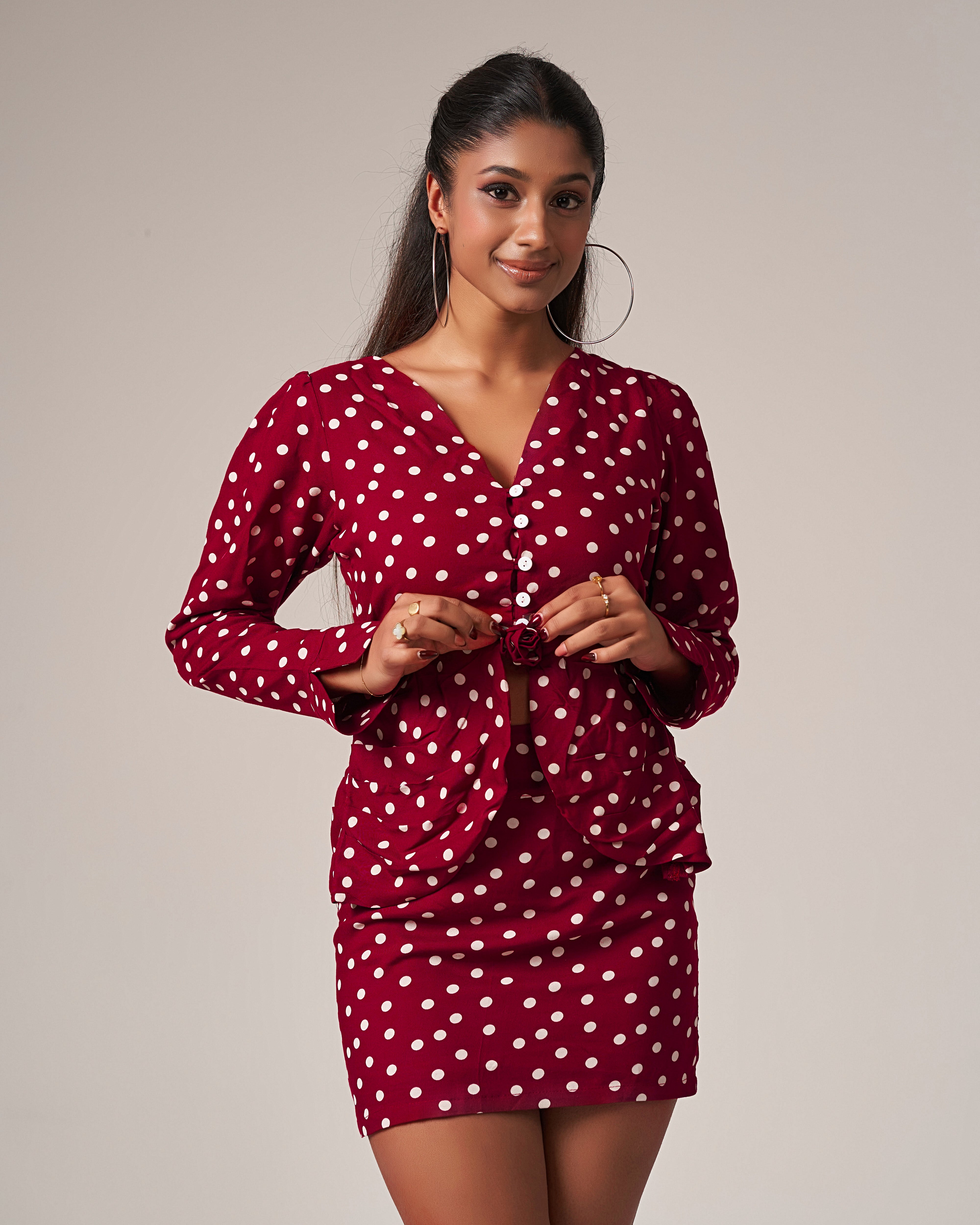 Ruched Polka Dot Chiné Mini Set with a Rose, a charming blend of vintage flair and modern feminine style. Featuring a deep rose-red hue scattered with classic white polka dots, this two-piece set is designed to make a sweet yet confident statement.