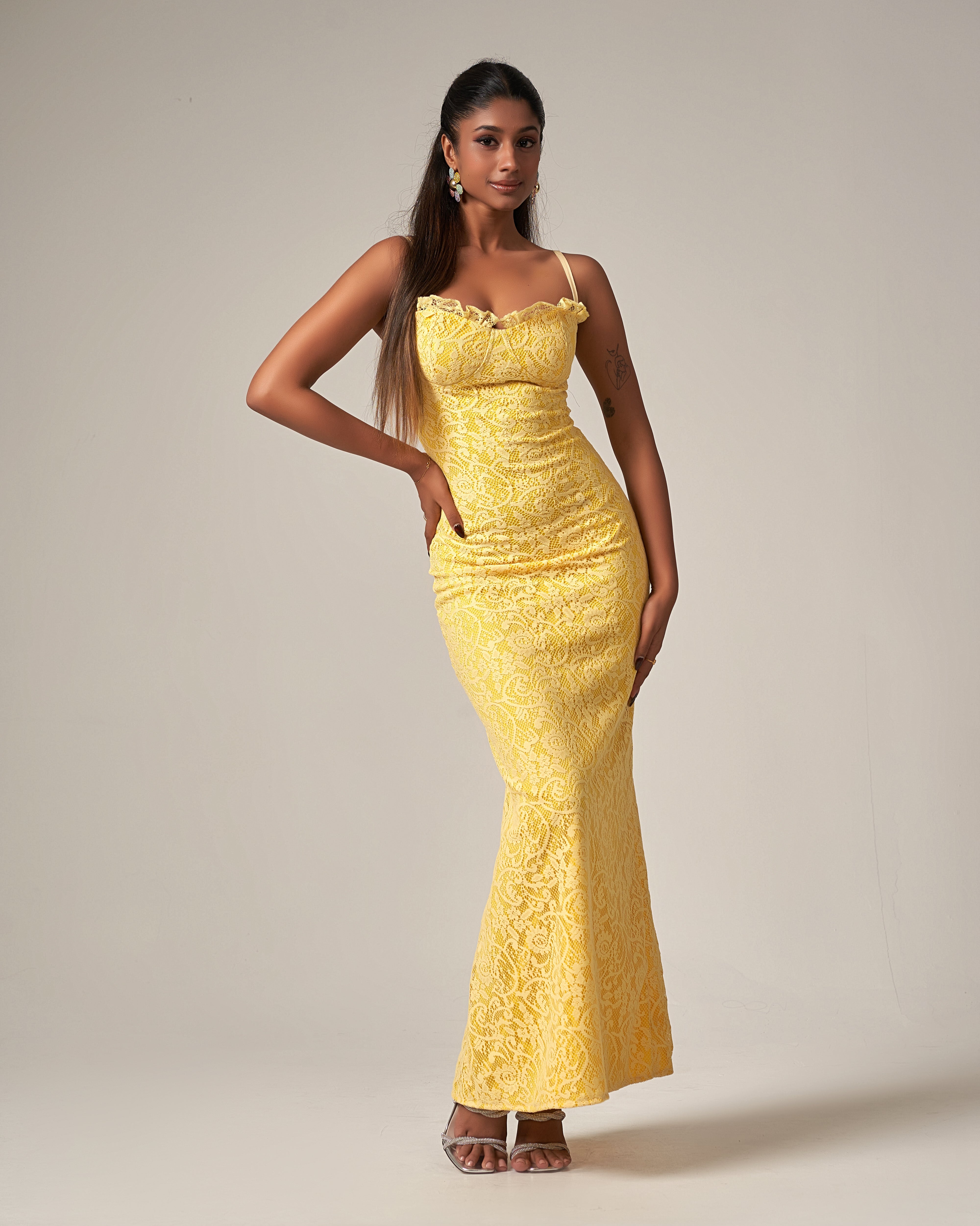 Sunlit Beam is a lace maxi dress designed to capture light and confidence with every step. Crafted in a soft yellow lace, this figure-enhancing silhouette blends warmth, femininity, and refined elegance.