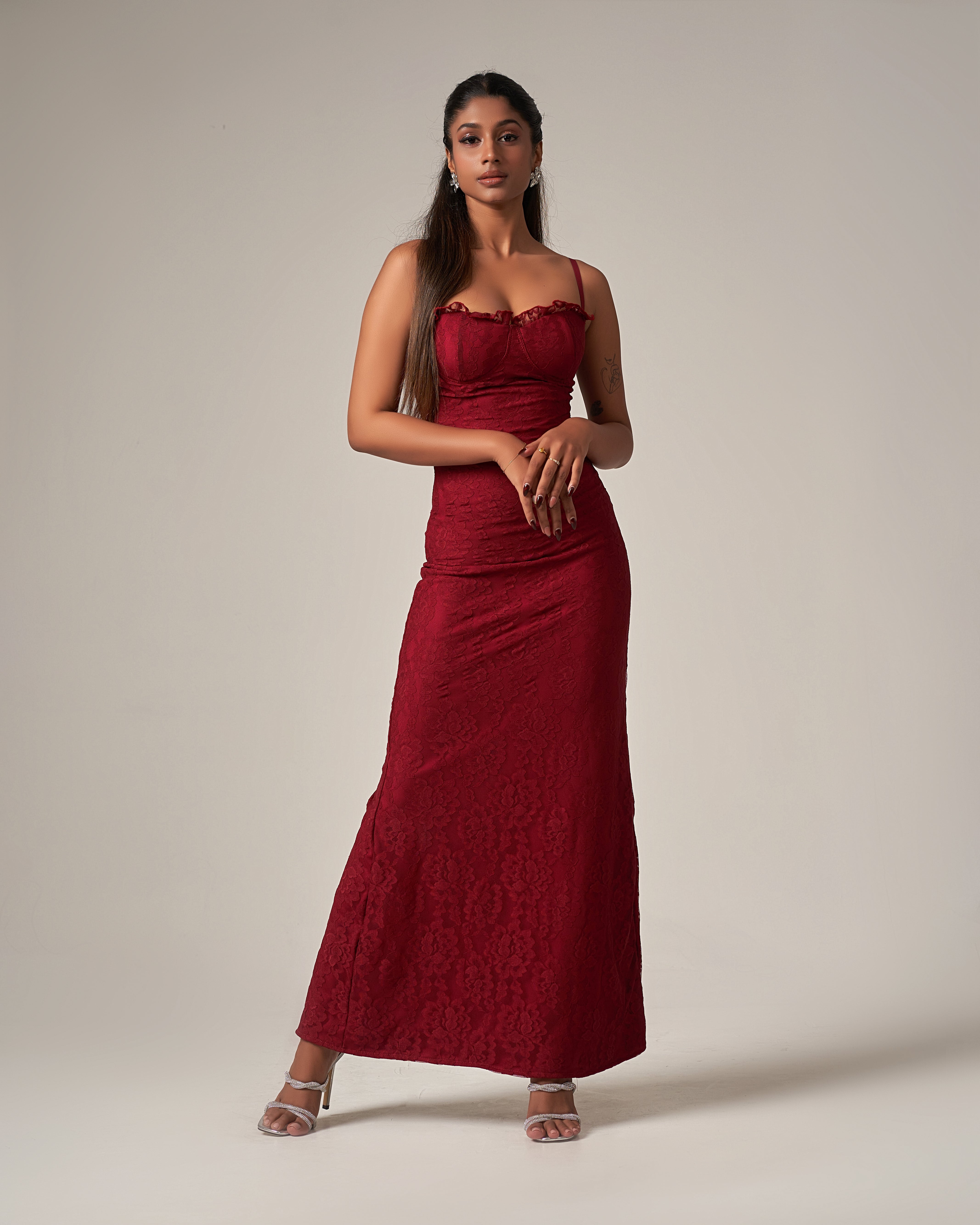 Featuring a structured bust with delicate lace detailing and slim shoulder straps, Burgundy Allure shapes the waist before flowing into a sleek maxi length. Ideal for evening events, formal occasions, or moments that call for classic glamour with depth.