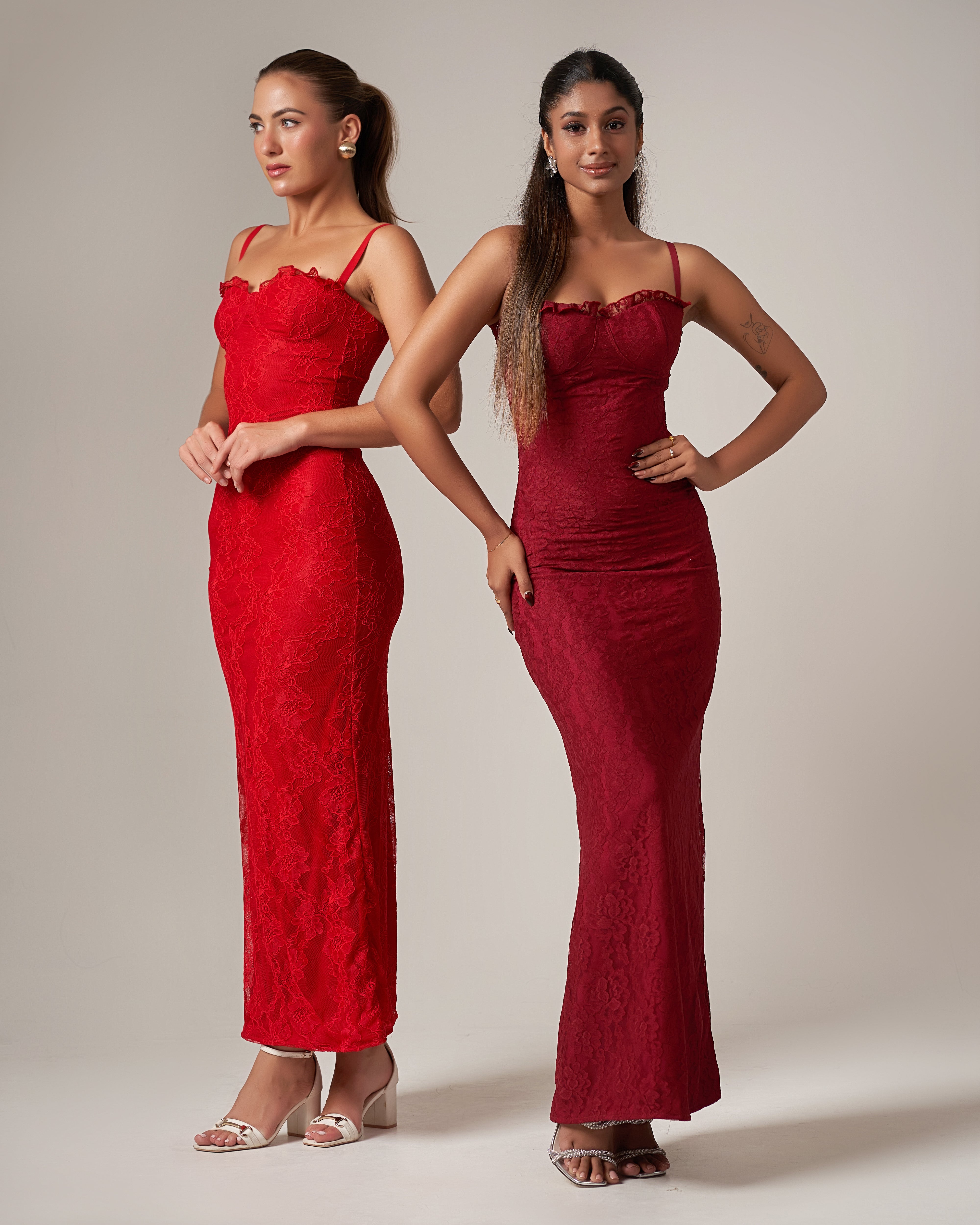 Burgundy Allure is a lace maxi dress designed to flatter the body with a refined, feminine silhouette. Crafted in deep burgundy lace, this piece brings timeless elegance with a bold, romantic edge.